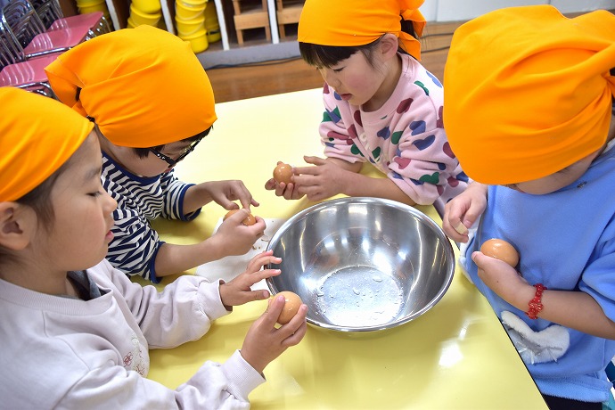 みんなはゆで卵のむき方は知ってるかな? しってるよ~!とみんなの声。