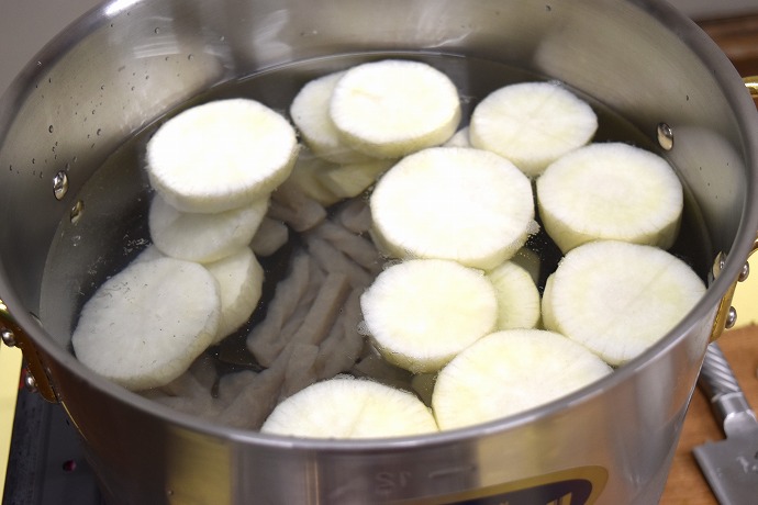 さてさて、お鍋にむすびこんにゃくと大根が入りました~