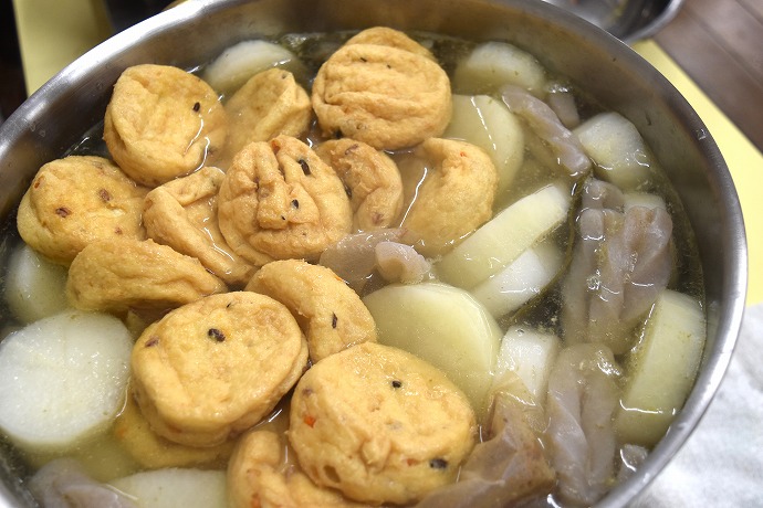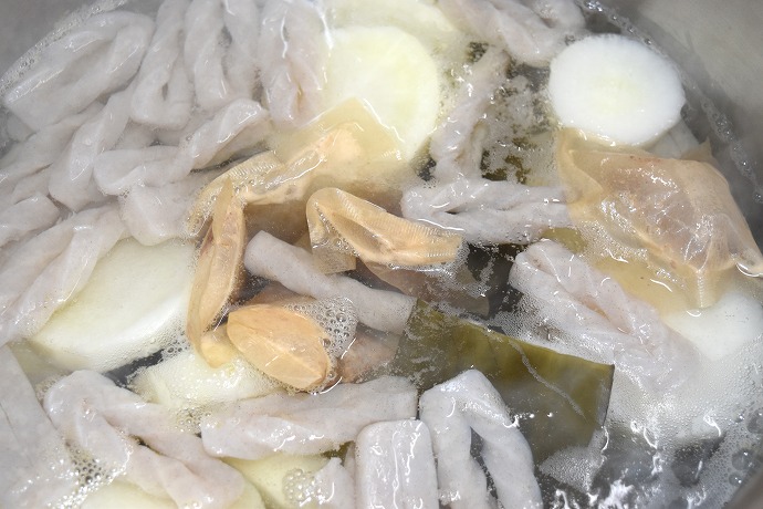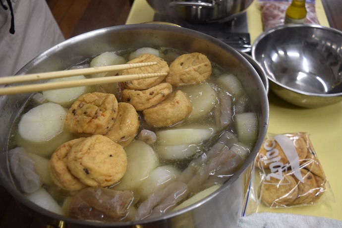 大根、むすびこんにゃくがぐつぐつ。(むすびこんにゃくはお鍋に入れる前に湯通し済みです)