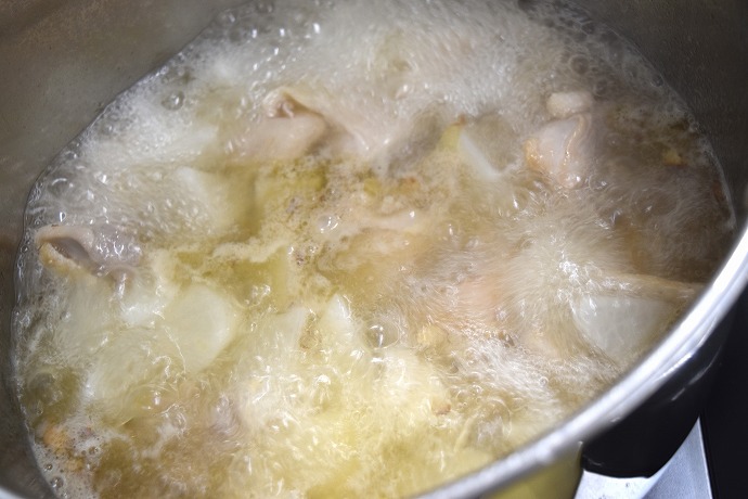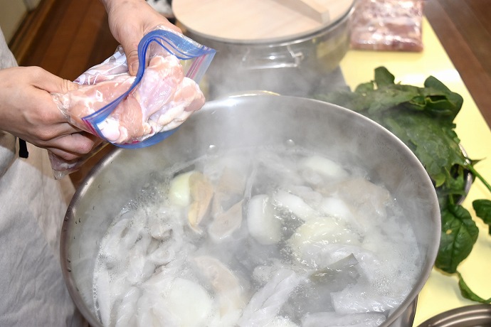 手羽元を入れま~す。骨の両際で切り目も入れています。よいスープが出るように👏