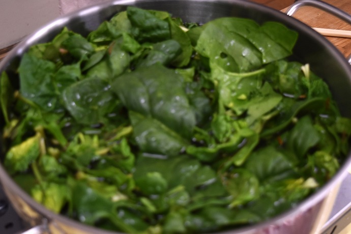 ちぢみほうれん草の中に入り込んだメタセコイアも取り去り😊✌、あとは和えるだけ💚