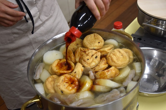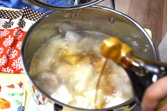 あくを取ってから天然かけ醤油(川中醤油)入りま~す。