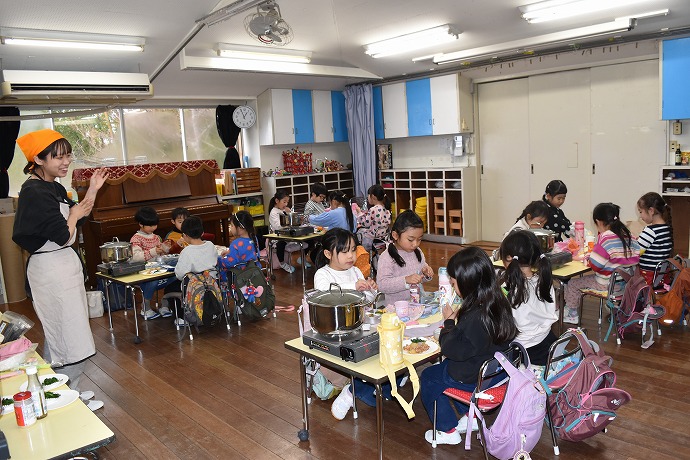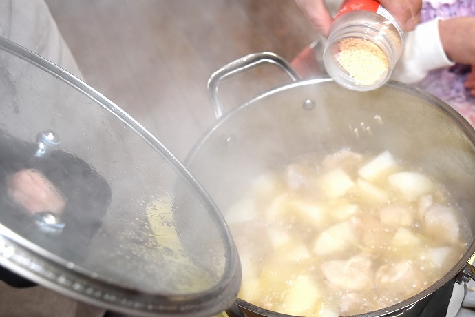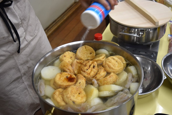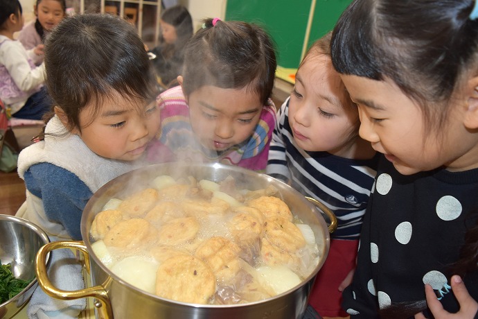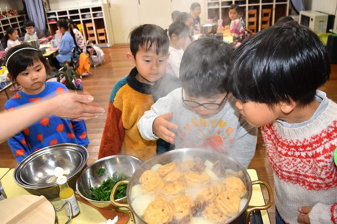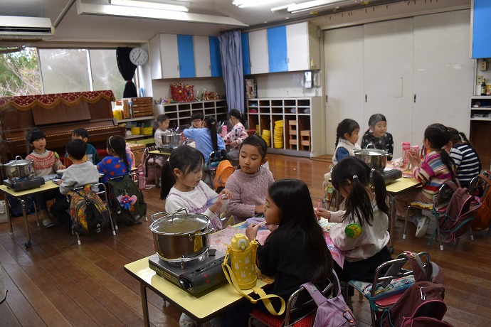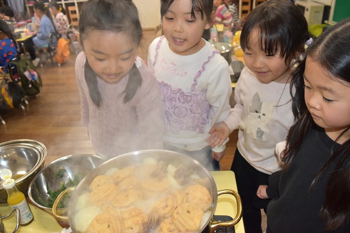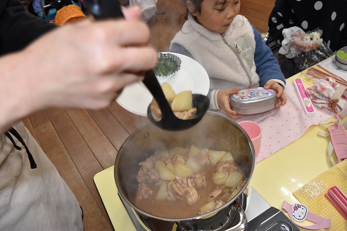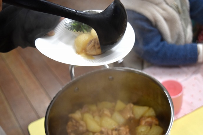 各テーブルのお鍋”鶏肉と大根の煮物”がもう一息といったところです。お昼時間は過ぎてみんなはお腹が空いて早く食べたい!の気持ちが高まっています✨