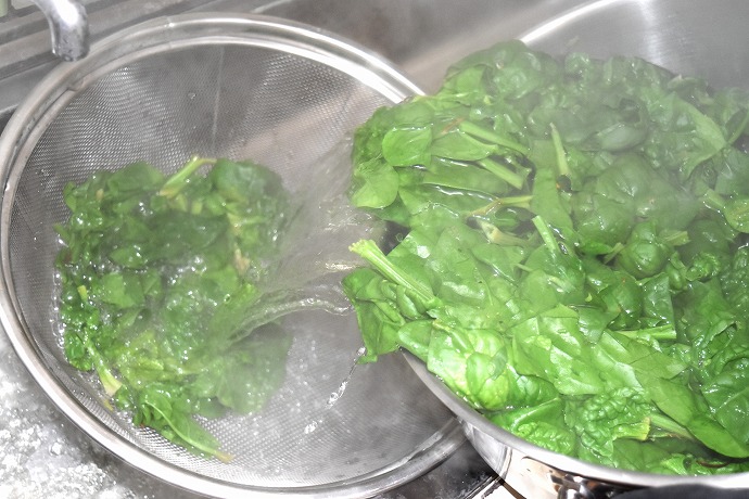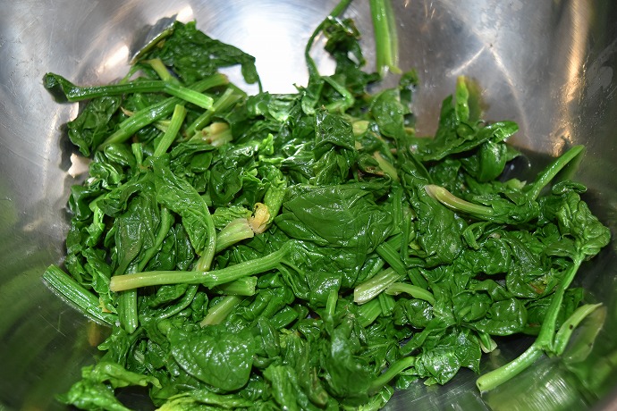 ボウルに準備完了! ”ちぢみほうれん草の和えも物”に。