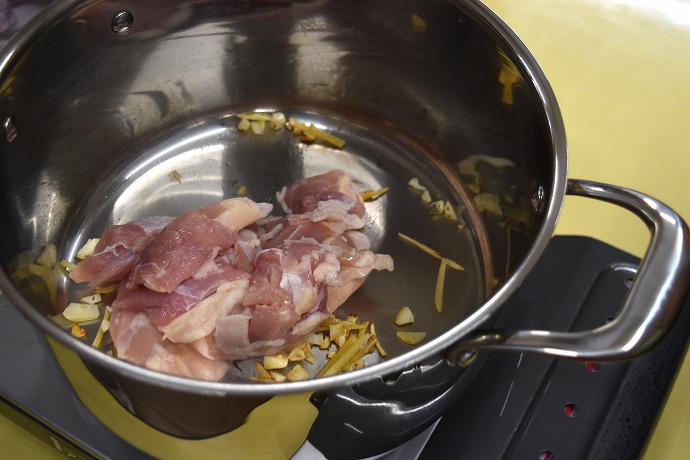 刻みにんにくと刻みショウガを少しずつお鍋に入れます。すでにごま油がお鍋には入っています。