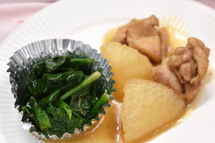今日のクッキングメニューは「鶏もも肉と大根の煮物」「ちぢみほうれん草の和え物」そしてこの日は食べずに翌日まで火を入れながら煮込む「おでん」🍲✨