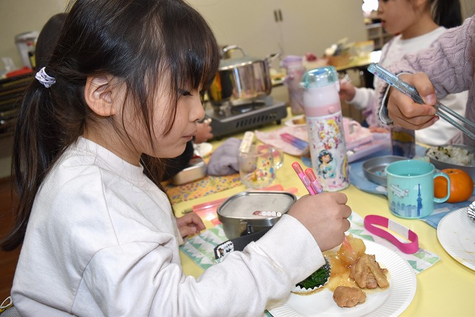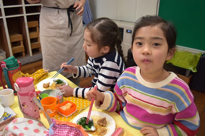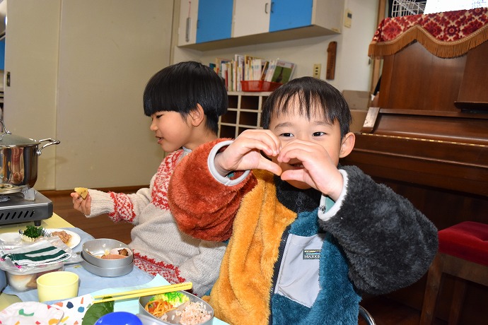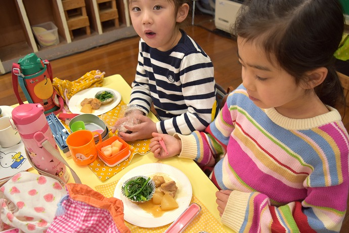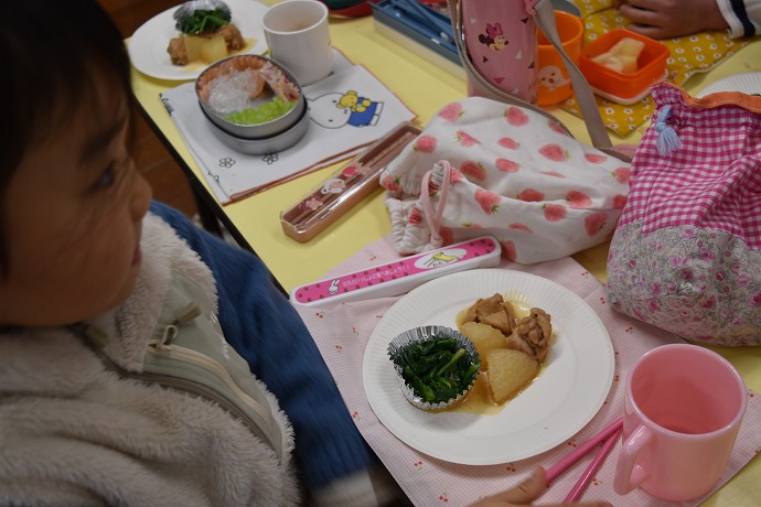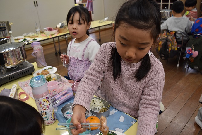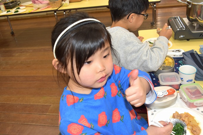 ほぼお弁当を食べ終えた様子ですが、まだ入りそうな年長さん達です。