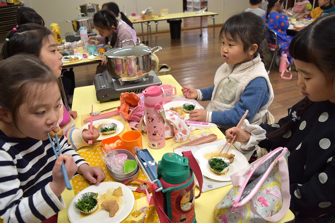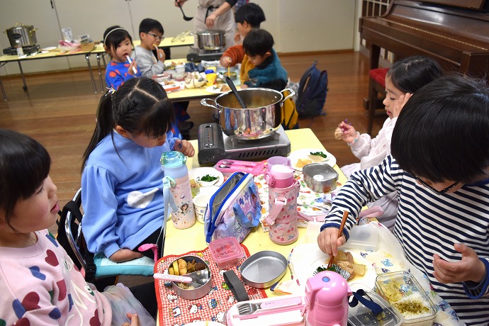 お出汁も入れて。(実はお腹が大変空いた子ども達は先にお弁当を食べながら出来上がるのを待っていたのでした~)