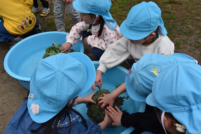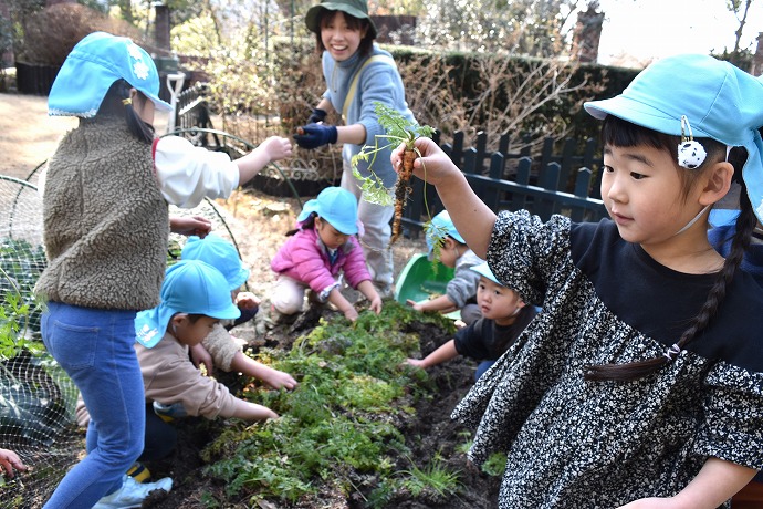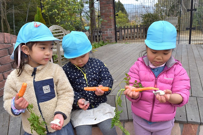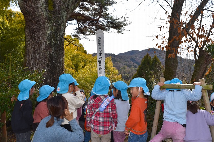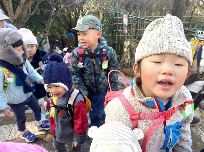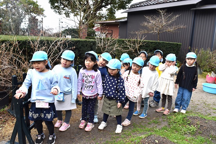 年少クラスがひみつの庭で過ごした後はそろそろお弁当🍱。園舎に戻ります。