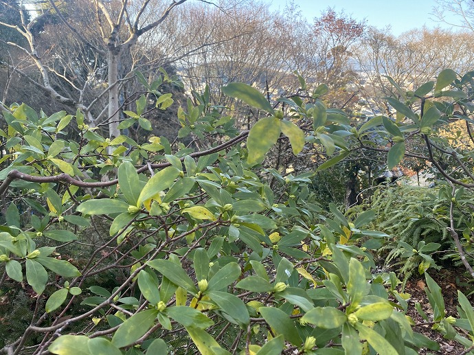 左のフェイジョアはほぼ実が落ちて、右のダイオウグミの葉っぱもいずれ黄葉して来春の芽出しの準備をするでしょう。
