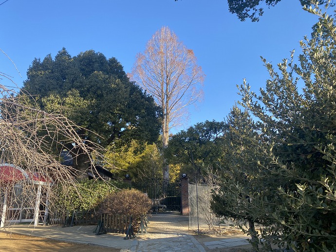ドイツトウヒのまわりは落ち葉。石畳の上は砂がのるのでいつも掃いては園庭へ戻します。