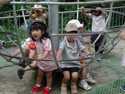 "いいよ、まわして〜!" "あ、まって〜! ぼく、おりる!"