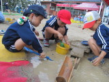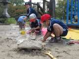 雨のあとは、しぜんと水たまりが人気のあそびばになります。
