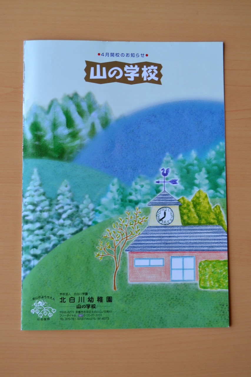 これがそのときのパンフレットです。表紙の絵は京都工芸繊維大学の中野仁人先生に描いていただきました。開講クラス名を見てみましょう。小学校の部として、『ことば』『しぜん』『かず』、中学校の部として、『英語の基本』『英語の読み書き』『数の基本』『数の世界』『日本語の読み書き』、高校・一般の部として、『英語の読み書き』『数と自然』『日本語の読み書き』『ラテン語入門』という名前が並びます。『ことば』の低学年は山下一郎先生、高学年は福西亮馬先生(4月から幼稚園の事務として着任)、『英語』と『ラテン語』は太郎先生、そして『しぜん』は私が担当する…。こうして、たった4名のスタッフで船出したのが山の学校の始まりです。