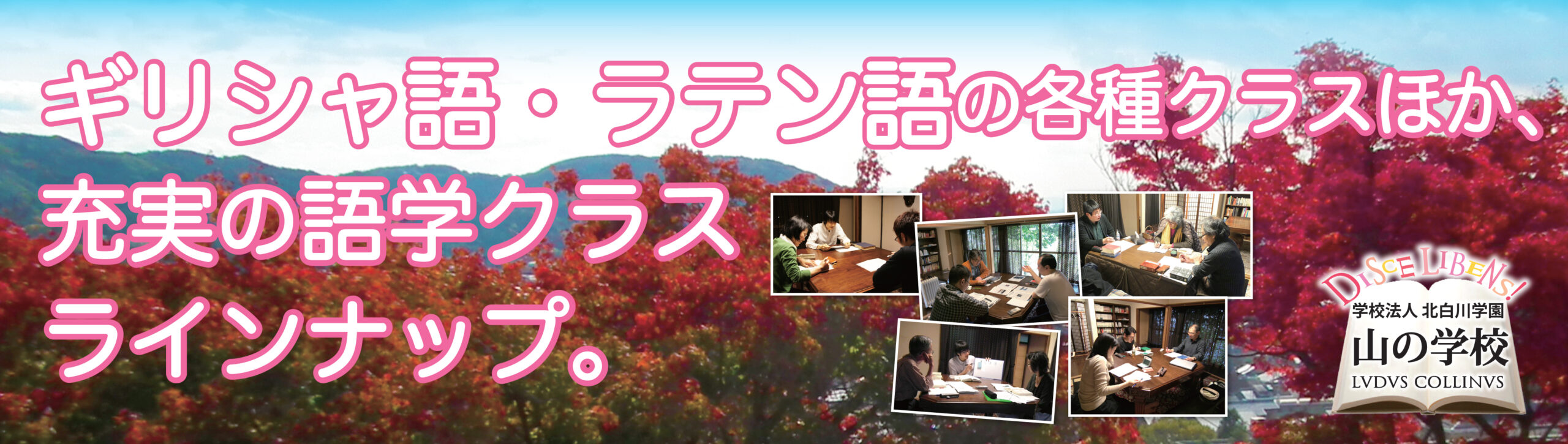 ★ 秋学期から開講するクラスはこちら! 画像をクリックするとクラス一覧(pdf)のPDFが開きます 小学生 中高生 希臘語 しぜんかいがひねもすことばかずウェブプログラミング中学数学中学英語高校数学高校英語英語特講れきし総合現代世界史西洋古典を読む西洋の児童文学を読むA西洋の児童文学を読むB中高生の哲学ウェブプログラミングギリシャ語初級文法ギリシャ語初級ギリシャ語中級Aギリシャ語中級Bギリシャ語初級講読Aギリシャ語初級講読Bギリシャ語上級Aギリシャ語上級Bギリシャ語上級C聖書を読む(原典講読) ゼミ 外国語 羅甸語 日本文化論を読むキリスト教思想を読むギリシア・ローマの歴史を読む西洋近代思想の古典を読む経済現代社会を考える現代世界史歴史論演習英語で味わうシェイクスピア西洋古典を読むウェブプログラミングイタリア語講読ロシア語入門ロシア語講読ドイツ語初級ドイツ語講読韓国語初級現代ギリシア語初級文法フランス語入門Aフランス語入門Bフランス語講読英語講読A(ディケンズ)英語講読B(フォークナー)漢文入門漢文講読Ⅰ漢文講読Ⅱ漢文講読Ⅲ漢文講読Ⅳ東洋古典を読むラテン語初級文法Aラテン語初級文法Bラテン語初級講読Aラテン語初級講読Bラテン語初級ラテン語中級ラテン語上級Aラテン語上級Bラテン語講習会(外部リンク) ★オンライン授業実施中。遠隔地、海外にお住まいの方も受講可能!