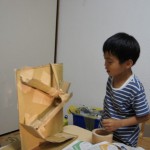 でもそれよりも何よりも、1段ずつスロープができあがるたんびに、早速ビー玉がすべるかどうかを確認したくなるのが人情というもの。それがワクワク、ドキドキして、楽しかったようです。ビー玉を何度も入れては、「あれなんで?」「やった!」の声があちこちで上がっていました。