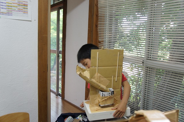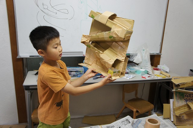 最後のスロープを滑り台にしたり、ぐるっと後ろへ一周するようにしたり、ゴールに箱を取り付けたりと、それぞれ自分のアイデアに大満足。