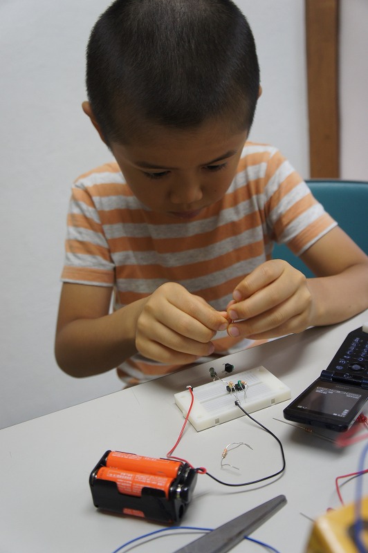 送信側の赤外線LEDや、受信側のフォト・トランジスタ、また駆動用のトランジスタ(FET)の説明をしました。