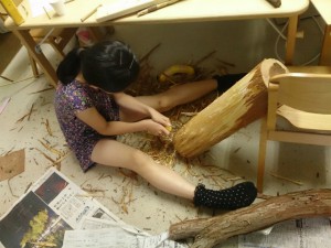Bクラスでは、自分たちが森のなかで拾ってきた材料を中心に、思い思いの工作を楽しんでいます。