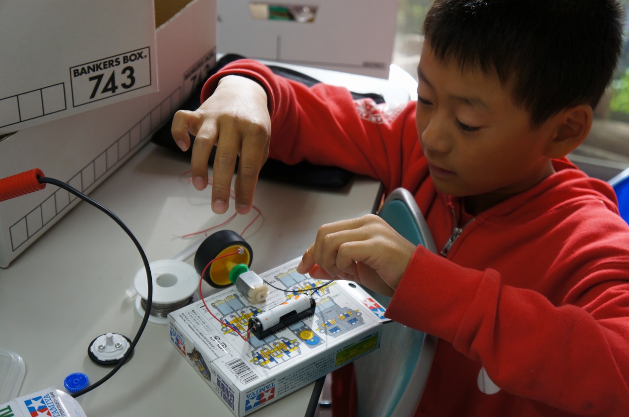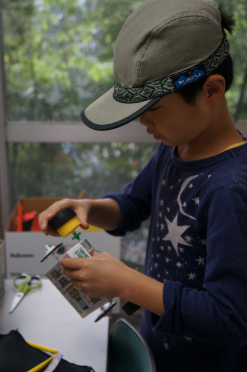 モーターに電池を直につなぐだけという構造でしたが、タイヤが勢いよく回ったことに、すでに大喜びの男の子三人でした。