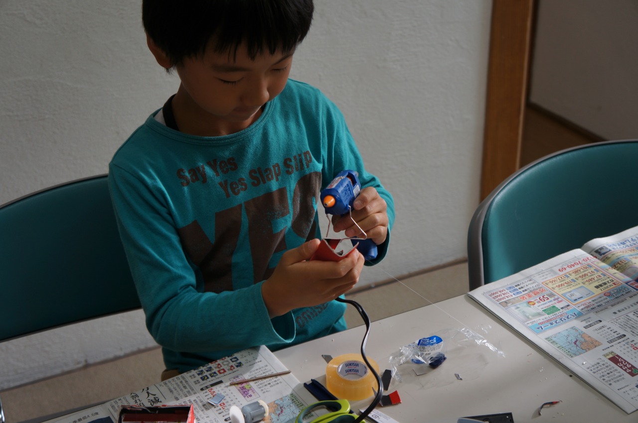 福西です。前回、スピードカーを作ったY君が、「今度はモーターを付けたい」と意欲を示していたので、モーターを使った工作をしました。