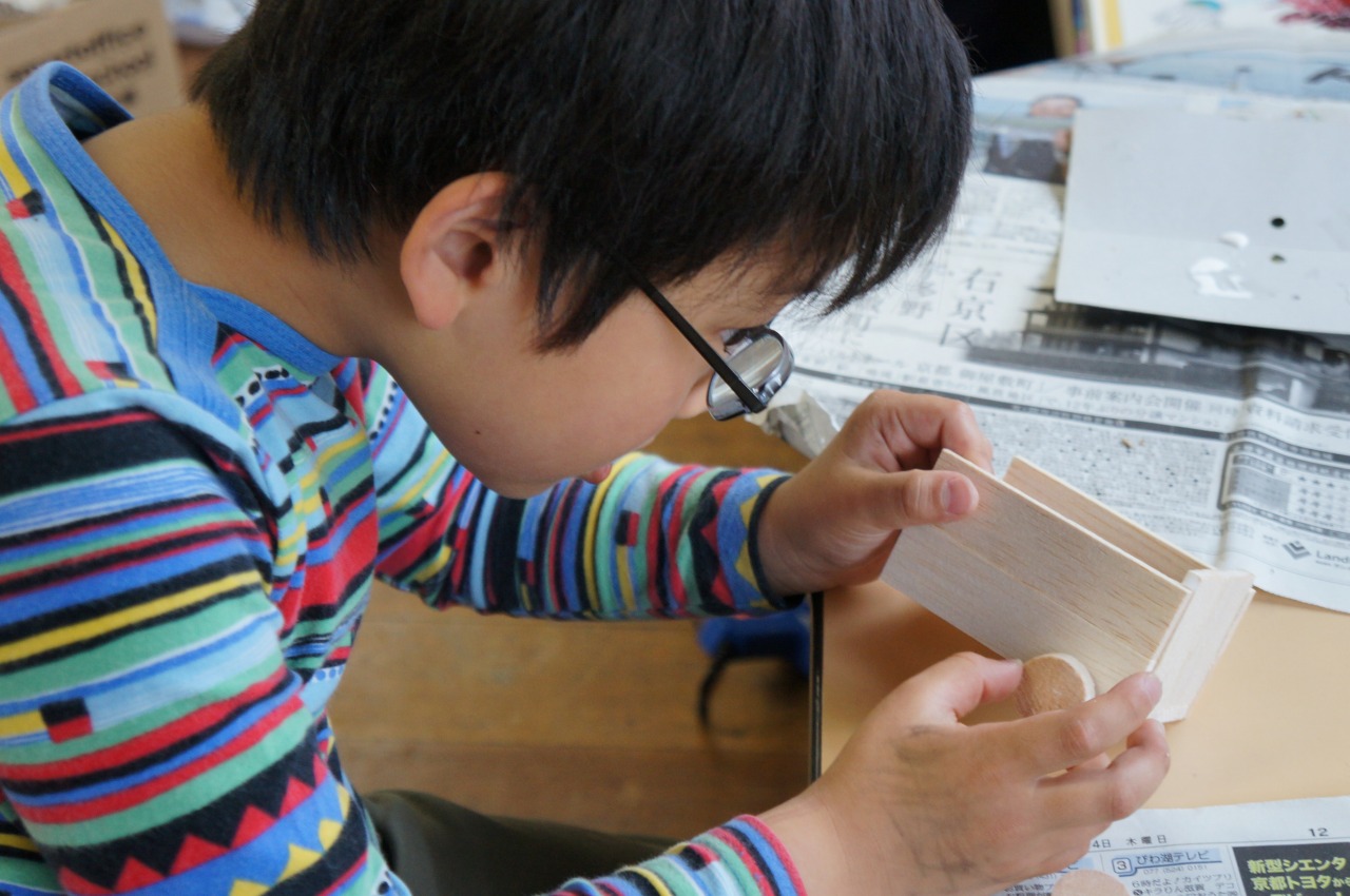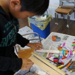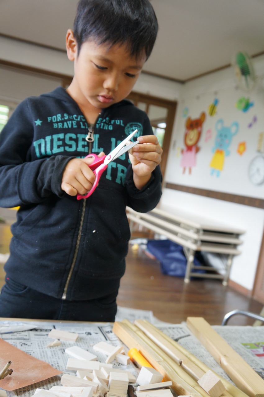 木材はバルサを使ったので、はさみでも切れます。角を切り落としたあとに紙やすりをかけると、「曲線」が作れることに、2年生の2人は「おお」と新鮮な驚きを発して、チャレンジしてくれていました。