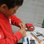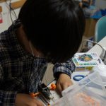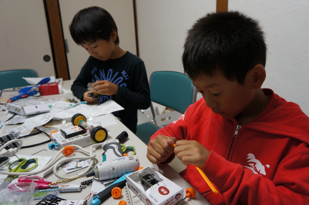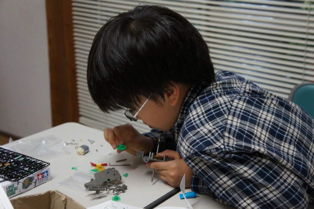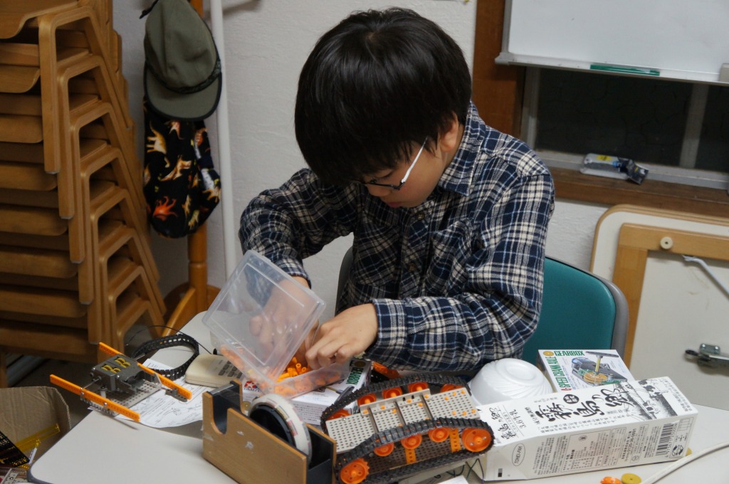 T君とR君はギアボックスを組み立てました。そのあとキャタピラを取り付ける構想を立てていました。紙箱とプラスチックをどうくっつけるかが思案のしどころです。今回はセロテープと瞬間接着剤を併用しました。R君は、以前C君の作った車を参考に、箱の中にギアボックスを収める工夫をしていました。T君はキャタピラが本体に干渉しないように浮かせたり、スペーサーを使うことに初挑戦していました。