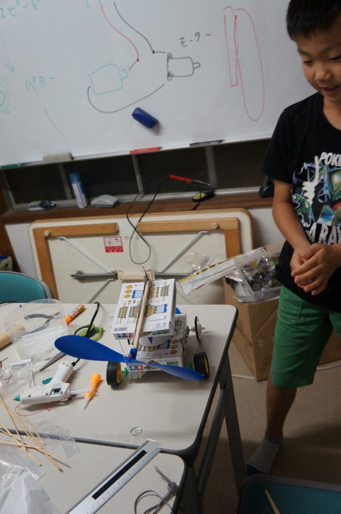 C君とY君は上に飛び上がるプロペラを作りました。残念ながら二機ともうまくは飛ばなかったのですが、ゴムの巻き数を多くして、本体をその力に耐えられる強度にすれば、改善するのではないかと思いました。Y君は前に作ったスピードカーとプロペラを合体させてスピードアップをはかるというユニークなことをしていました。
