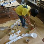 筒やレールを敷いて作ったコース上に、ボールを転がします。スライダーの傾斜をビューン!…とは、最初はいかず(苦笑)、ボールが引っかかったところを何度も改良しました。