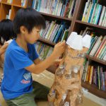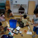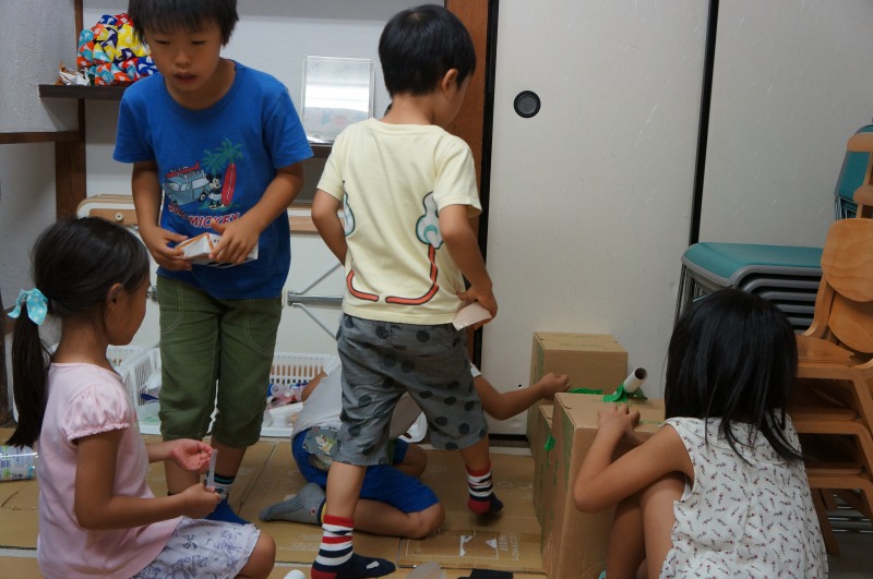 初回は、生徒たちが材料を持ってきてくれたので、それで自由工作をしました。
