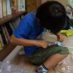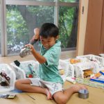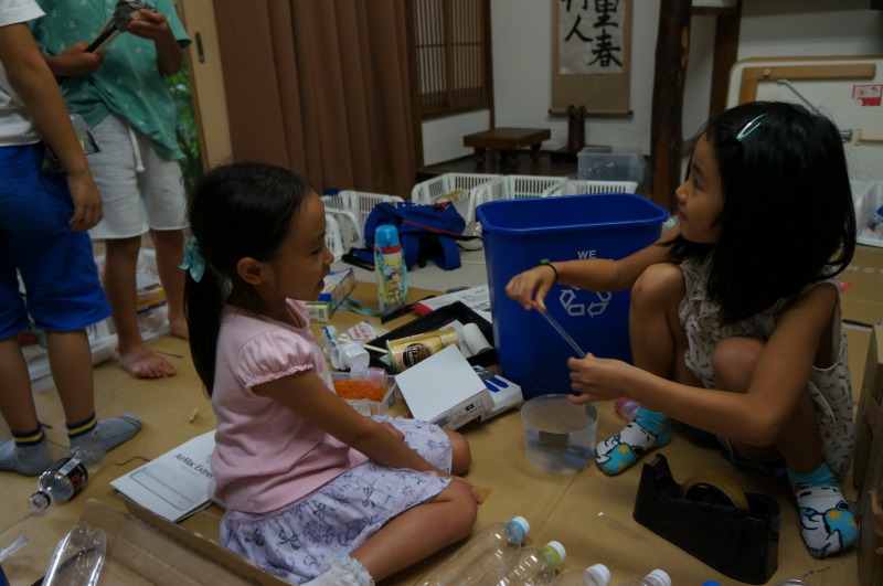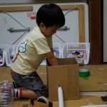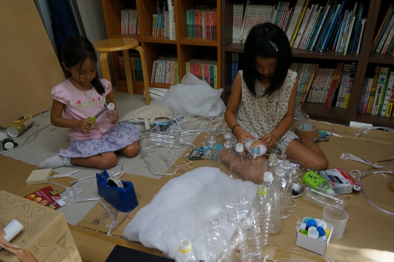 Hちゃんは、最初はE君の作るのを手伝っていましたが、材料をいろいろ見てもらった後に、ペットボトルでお家を作ることにイメージが固まりました。そこへ後から来たKちゃんが合流して、あとはずっと二人で床と柱を作っていました。ペットボトルのふたを枕にする構想の実現までは至りませんでしたが、何かを作ろうというワクワクは終始持ち続けてくれていました。