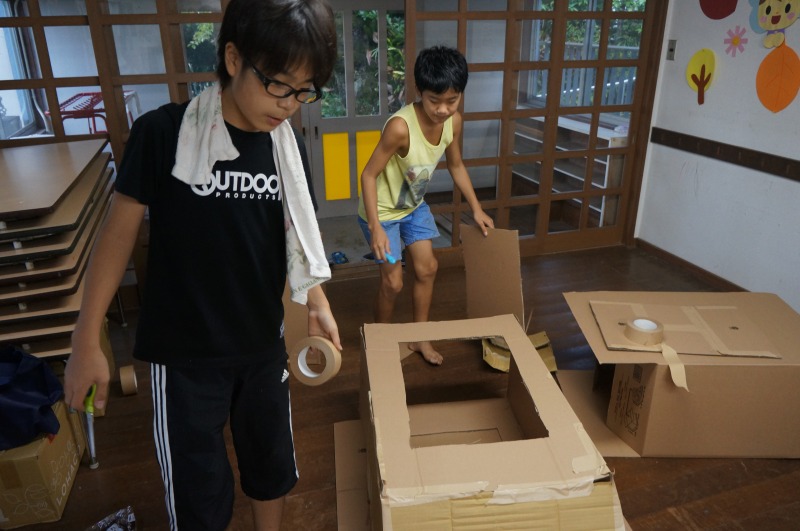 つくる5~6年(2016/10/3) 公開日:2016/10/05 つくる 福西です。 ダンボールで戦車を作りました。 はじまりは、この1個の箱から。 ハッチを開閉して、中に乗り込めるようにしようという、Y君のアイデアが実りました。 輪ゴムを使って、玉の飛び出す仕組みを作るT君。 「おお、けっこう飛んだ」 1回でここまで作れました。キャタピラは次回にしたいと思います。 関連記事 つくる2~3年(2016/9/15)ひねもす(つくる4~6年、2021/3/8)つくる4~6年(2018/2/5)つくる1年(2016/5/26)つくる1年(2016/4/21) 投稿ナビゲーション つくる1年(2016/9/29)つくる2~3年(2016/10/6)