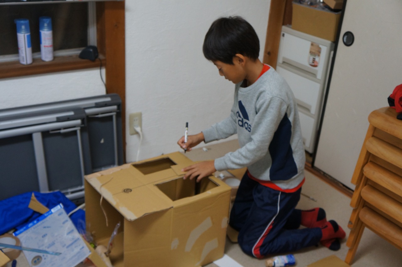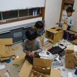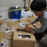 最初のポイントは、前面のボタンと後面の支え棒との間に渡す板を、水平にすることです。そのために、箱のぐるりに「同じ高さ」で線を引くことが要求されますが、3年生はみんなそれをクリアしていました。