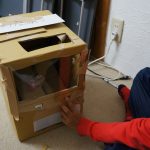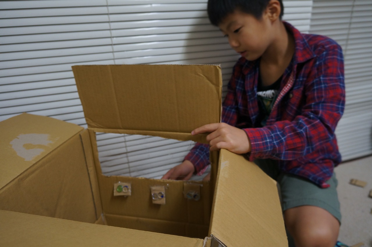 また、ボタンを押したときの板の落ちやすさは、板の長さがポイントです。(箱の奥行より少しだけ短くしますが、短すぎてもだめです)。板は、支え棒とひもでつなぐのですが、箱に奥行きがあって板が十分長いと(トルクがかかるので)、ひもを使わずともセロテープによる固定で大丈夫なようです。