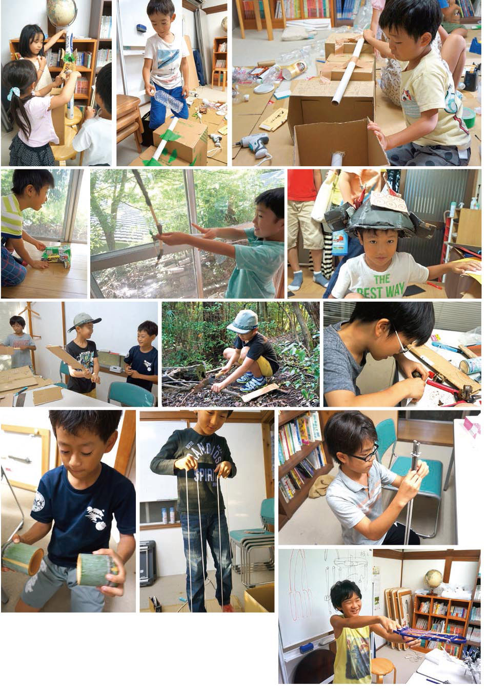 その他の取り組みでは、1年生はがらくた工作をしました。空箱やプラスチック容器をベースとし、そこに新しい素材を追加するたびに色々な物を作ってくれました。たとえば割りピンからは「時計」ができ、綿からは「ベッド」ができました。また、輪ゴムからは弓ができ、ビー玉からはビー玉スライダーができました。弓は最初、箱の角に輪ゴムを引っかけて飛ばす仕組みでした。それをSin君が自分で考案しました。また、春学期の後半にEi君の持って来てくれたビー玉スライダーをみんながすごいと言って、それを作ることが流行りました。作るたびにその都度、新しい改良が見られました。2~3年生は鎧兜を作りました。Syun君が戦国時代を好きで、夢中になる様子が伝わってきました。鎧兜の進化がこれからも楽しみです。3~4年生はのこぎりを使い始めました。枝を拾ってきて木工細工をしたり、竹を切って竹ぽっくりを作ったりしました。「のこぎりホルダーを作ってから山奥へ行こう」と私が言うと、生徒たちはさっそくダンボールを持ち出して、ものの10分もかからないうちにそれを作り上げて腰に下げていました。そのフットワークの軽さに目を瞠りました。5~6年はひねもす工作をしました。さすが6年生で、だんだんと工夫が精緻になり、アイデアを即興で実現するところに力を感じました。