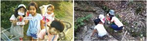 春学期は「○○先生は秘密基地をつくってた!だからつくりたい!」「△△先生はこんなものつくってくれてたよ!」と過去に見聞きした情報を元に同じことを私に求めて来ましたが、今では山を歩いて生き物を探し、じっくり観察するという“森山イズム”が浸透してきたように思います。私は生物学が専門ですので、私ならではの興味深い情報を彼らに伝えられるように意識しています。出会う生物はいつも決まっていてサワガニとカエル類、昆虫類なのですが、みんな毎回山に行くのを楽しみにしてくれているようです。カエル類の種判別もできるようになってきました。また、虫かごの中で大きいサワガニが小さいカエルを捕食してしまう事件が起こった後、そのことを考慮して虫かご内をレイアウトするようになりました(写真2、3)。時にはせっかくカエルを捕まえてもサワガニとの大きさの相性を考えてその場で逃がすこともあります。私が企画しなくても、自然と命の大切さを学んでくれているようです。今後の季節は生き物が出づらくなりますが、何か企画してさらに“森山イズム”を吹き込んでいこうと思っています。
