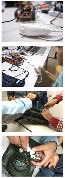 前学期に引き続きarduinoを使って、キャタピラで走る戦車のようなロボットを製作しています。DCモーターの制御は終わり移動に関しては、前学期までに完成していたのですが、砲台のためにサーボを載せたりスピーカーを載せたりしているとコントローラーが複雑でぐちゃぐちゃになっていきました。ロボット本体はタミヤ製のプレートやキャタピラを使用しており、これらは非常に汎用性が高く扱い易かったのですが、コントローラーとなるとそうは行きません。ブレッドボードに加速度センサーやジョイスティックをつけて無理矢理使っていたのですが、機能を増やせば使いづらくなるばかりでした。そこで、任天堂のWiiのコントローラーであるWiiヌンチャクがarduinoで簡単に制御できるようにライブラリが公開されていたので使ってみました。加速度センサーとジョイスティック、ボタンが2つ、と製作中のロボットにうってつけのコントローラーでした。