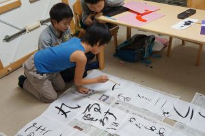 ことば2~3年(2017/01/18) 公開日:2017/01/19 小学ことば 福西です。 前半、雪で少し遊んだあと、俳句を作りました。 さむい中うごいてすぐにあたたかい Rin 竹のつつゆきをなかいれほそゆきだ Yu つららをね雪だるま上ぼうしだな Rin ゆきだんごみぞにながしてころころと Yu 雪がっせんりょうま先生アウトだな Rin ゆきがっせんりょうませんせいあてまくる Yu 後半は、筆と墨を使いました。今回は「しりとり」をしました。 関連記事 ことば3~4年(2018/12/5)0418 ことば2〜3年『ことば』3〜4年/4〜5年クラス便り(2017年6月)11/15 ことば3~4年A0905 ことば2〜3年 投稿ナビゲーション ことば3~4年(2017/1/17)0118 ことば1〜2年