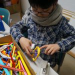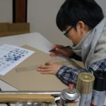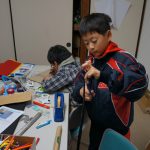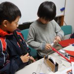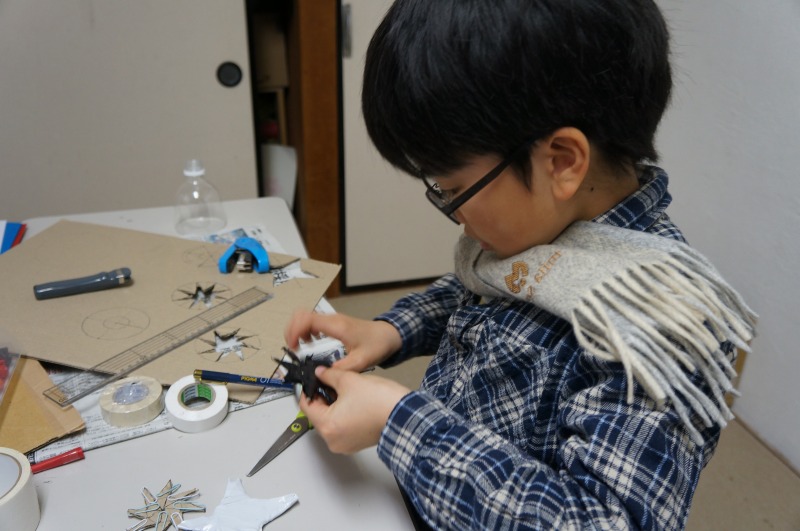 手裏剣では、下書きでコンパスや分度器を使って点対称に描くことが新しい体験でした。また下書きの細かな線をカッターナイフで切るのを頑張りました。(ダンボールなのでこれが結構難しいのです)。最後はおもりをつけて飛ぶようにしました。