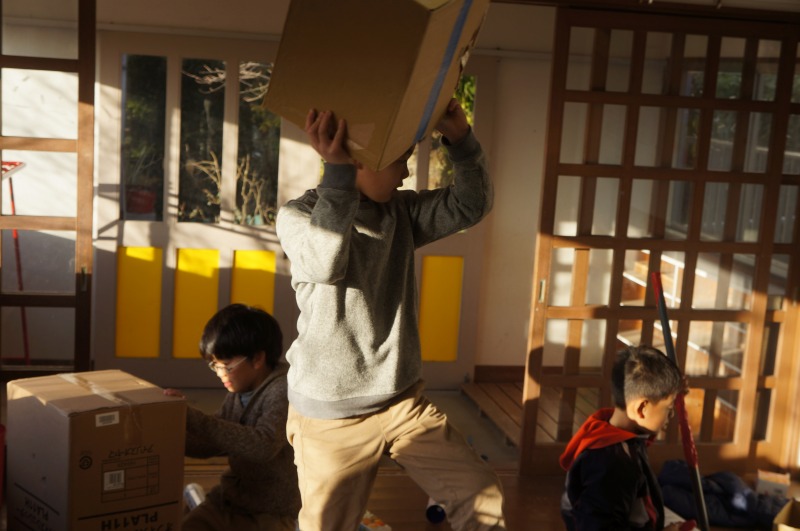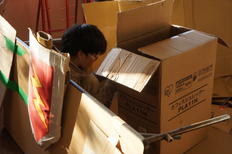 「なら、場所を移動したいので、ダンボールを運んでくれる?」と生徒たちにお願いすると、「任せとけ!」と言わんばかりに意気込んで、ダンボールやガムテープや工具をせっせと運んでくれました。