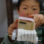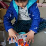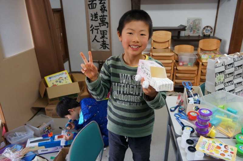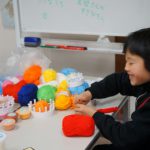 Hotaka君は、材料の山から毛糸を見つけるなり「これがしたい」と申し出てくれました。おばあちゃんがお裁縫上手とのことで、シャツを編んでくれた話や、「靴下のこことか、ズボンのこことかも塗ってくれたんや」と教えてくれました。すぐにコツをつかんで、「早くできるようになった!」と嬉しそうでした。最初はミサンガみたいにするところ、予定の長さを越えて、「やっぱりマフラーにする」とのことでした。お向かいに座っていたKanaちゃんと、編み物友達のように話しながらしていました。最初の緊張もすぐにほぐれたようで、よかったです。