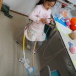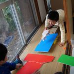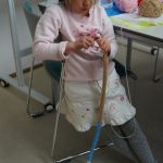 Kanaちゃんは、前回のリリアンの続きをしました。色を変えるところにKanaちゃんのこだわりが見られます。そして、あれよあれよという間に、すごく長くなりました。「こんなに長くなった! なわとびもできるよ!」とのことです。ペースアップしたことで、俄然楽しくなってきたようでした。また、向かい合わせで同じくリリアンをしていたHotaka君と話の馬が合い、何度も爆笑していました。
