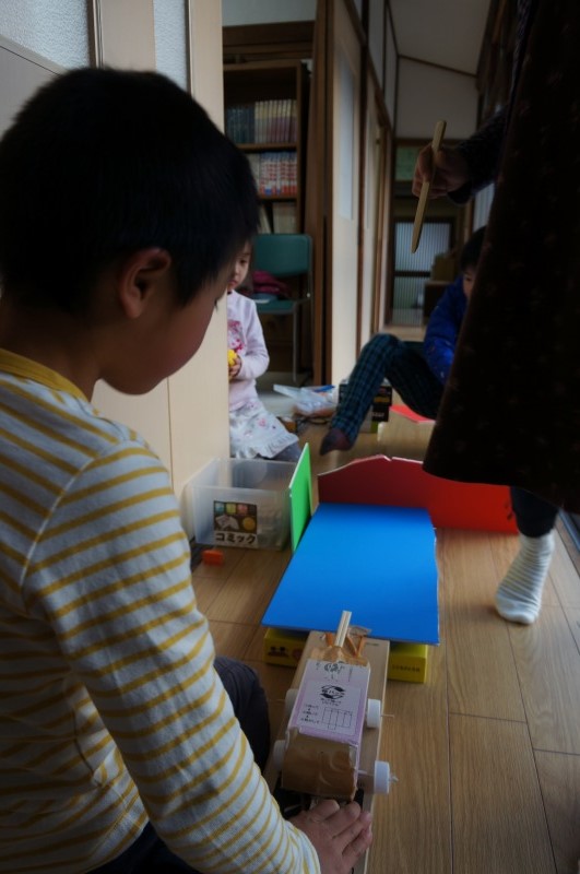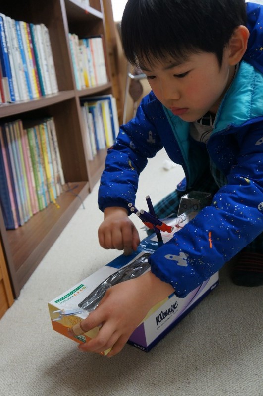 Sin-ichiro君は、作りたい物を先に決めてきたようでした。「車! 車が作りたい!」と言うなり、さっそく作り出しました。「お家でやった時はうまくいかなかったけど、小学校で見て覚えたやり方を真似たらできた!」と大喜びでした。たぶん、「箱の幅<車軸の長さ」であることと、タイヤ(ペットボトルのふた)に、ドリルで「中心」にうまく穴を開けられたことが成功の要因だろうと思います。さらに、「ゴムで引っ張って発進する」ように工夫していました。