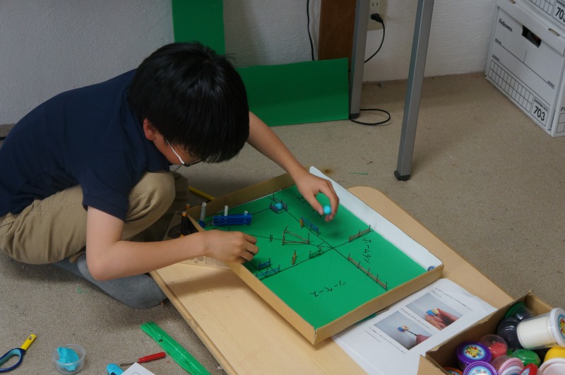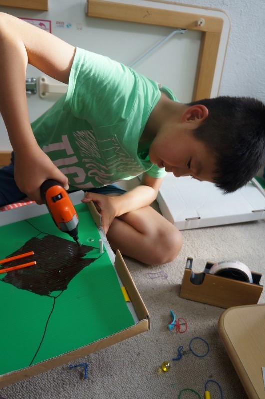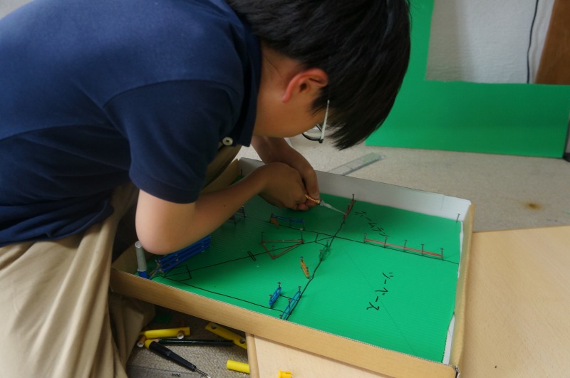 ピッチャーは最初、手転がしを想定していましたが、生徒たちからアイデアを出してくれました。スライダー式とゴム式とが見られました。