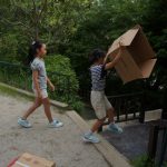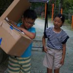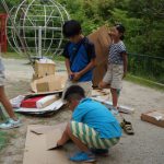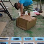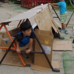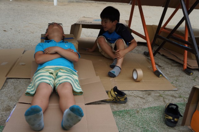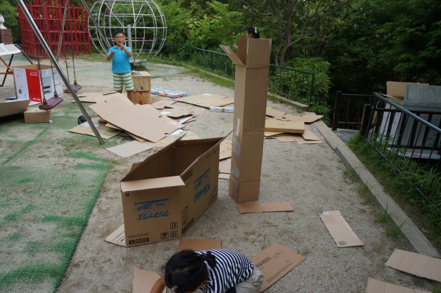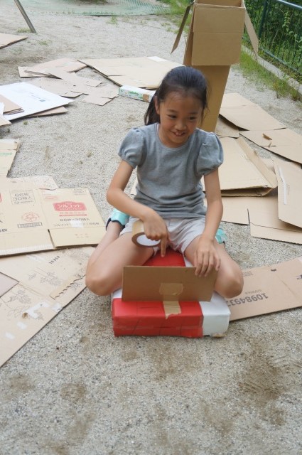 「すべりだいがいい!」というAkoちゃんのかけ声のもと、園庭でダンボールを広げて制作しました。