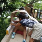 Nao君とKai君はウッドデッキハウスを、AoちゃんとAkoちゃんは「未来のトンネル」のすべり台を作りました。ウッドデッキハウスには腰かけイスとベッドが備え付けてあります。すべり台にはタイムマシン1号と2号があって何度も往復しました。