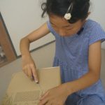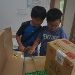 N君のそれを見て、Aちゃんも実現したく思いました。そこで箱の大きさや穴径、ダンボールの硬さなど、「どれが原因かなあ」と2作目で探求する姿が見られました。結果、Aちゃんも「わっか」の打ち出しに成功しました。