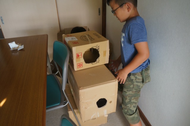 飽きるまで何度も実験を繰り返しました。その間、R君は的と照準器を作りました。また空気砲と基地との合体も考えました。N君と一緒に盛り上がって楽しそうでした。