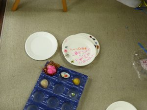 1~4枚目 女子グループは貝や紙皿に色を付けたり、スパンコールなどの装飾を施したりしました。
