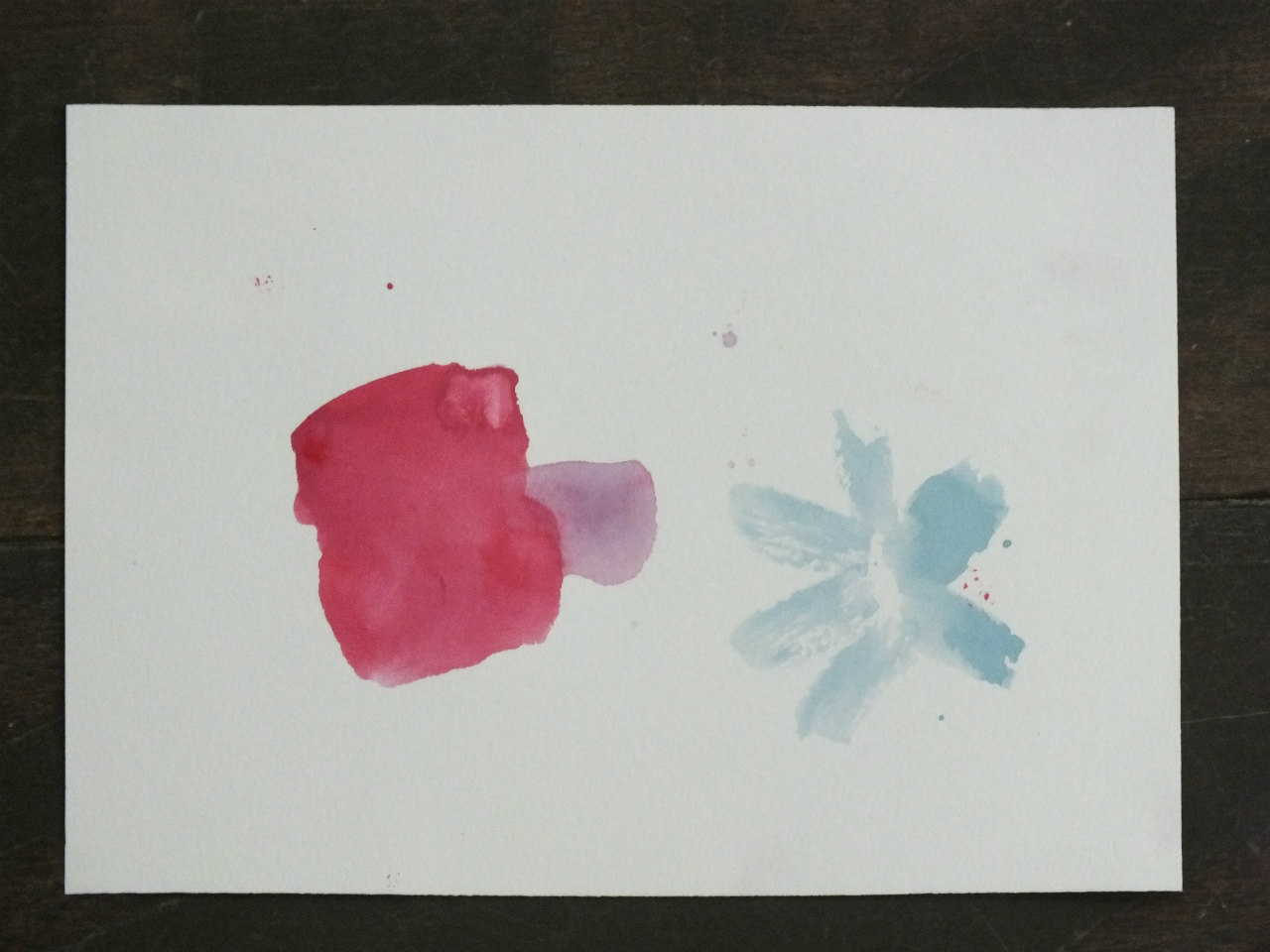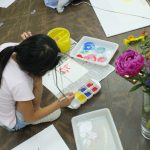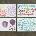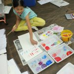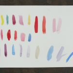 出来上がったお気に入りの色を、画用紙の上にサンプルのように並べて配したり、同心円状に筆を置いて花型にしたり、或いは、試し塗り用に置いておいた紙の切れ端が、ちょうど本のしおりになると考え、気に入った色に塗って持ち帰ったり。ただ混色の実験と言っても、そこから自由な発想が様々に生まれたことを嬉しく思いました。